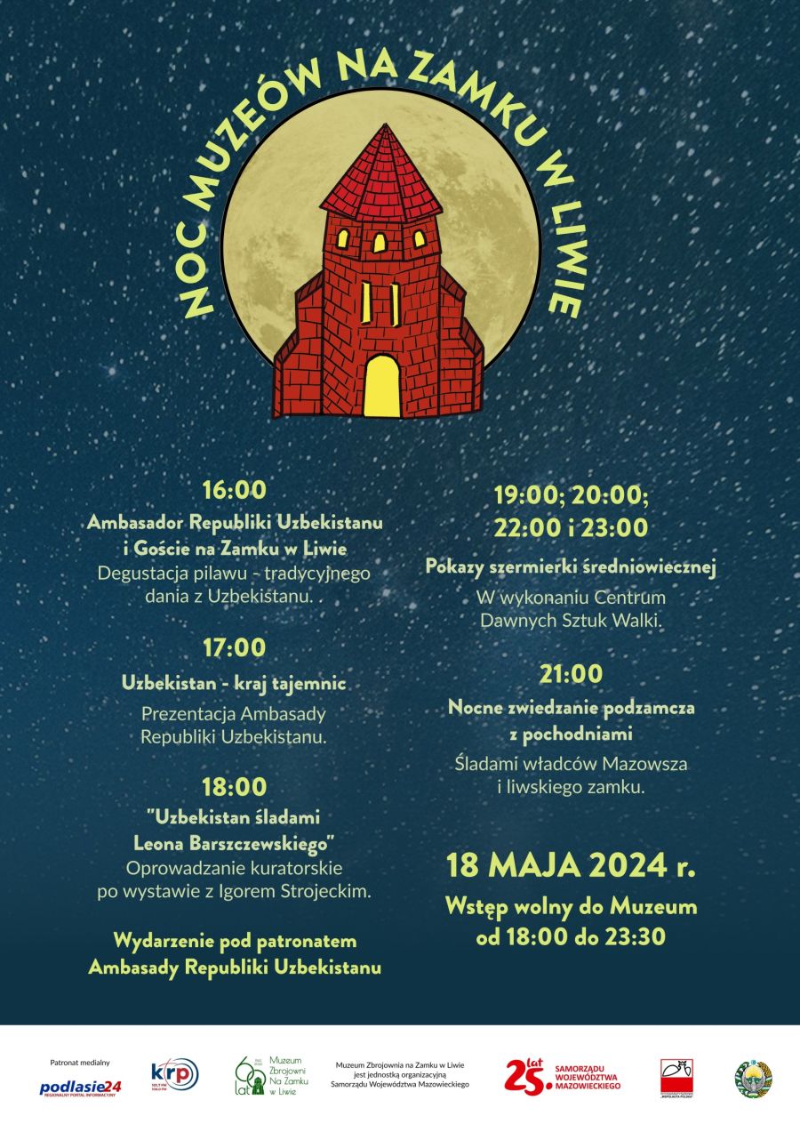 Dodane 2024-05-10 Zamek w Liwie ma przyjemność zaprosić na wyjątkowe wydarzenie - Noc Muzeów, które odbędzie się 18 maja od godziny 18:30! W programie czeka na Państwa moc atrakcji:Degustacja pilawu przygotowana przez Ambasadę Uzbekistanu Prezentacja o UzbekistanieOprowadzanie kuratorskie Igora Strojeckiego po wystawie "Uzbekistan śladami Leona Barszczewskiego"Pokazy szermierki średniowiecznejNocne zwiedzanie z pochodniami. Muzeum Zbrojownia, Wieża Zamkowa oraz Piwnice Gotyckie będą do Państwa dyspozycji do godziny 24:00.Wstęp jest wolny. Serdecznie zapraszamy do Liwa!Źródło: Muzeum Zbrojownia na Zamku w Liwie Mapa Wyświetl większą mapę >>